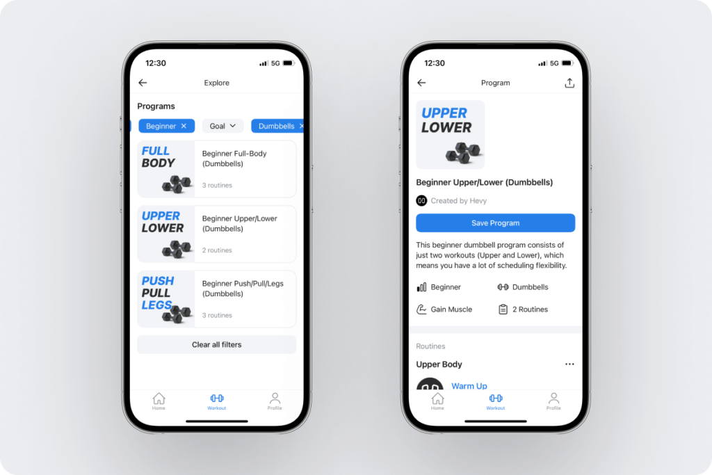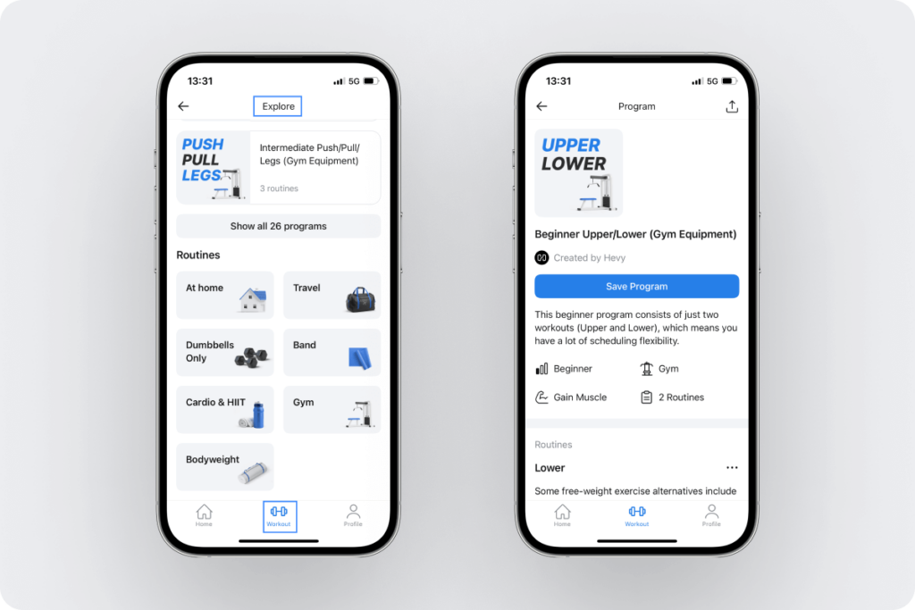 Explore Hevy’s routine library for 25+ training programs and individual workouts split into categories like travel, home, equipment-free, and HIIT. See each plan’s details and save the one you like to your profile to edit and use anytime.