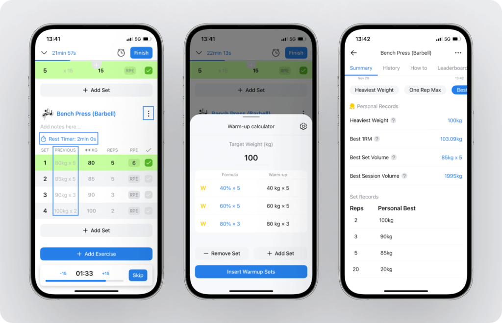 - Warm up set calculator to add as many warm-up sets as needed with just one tap