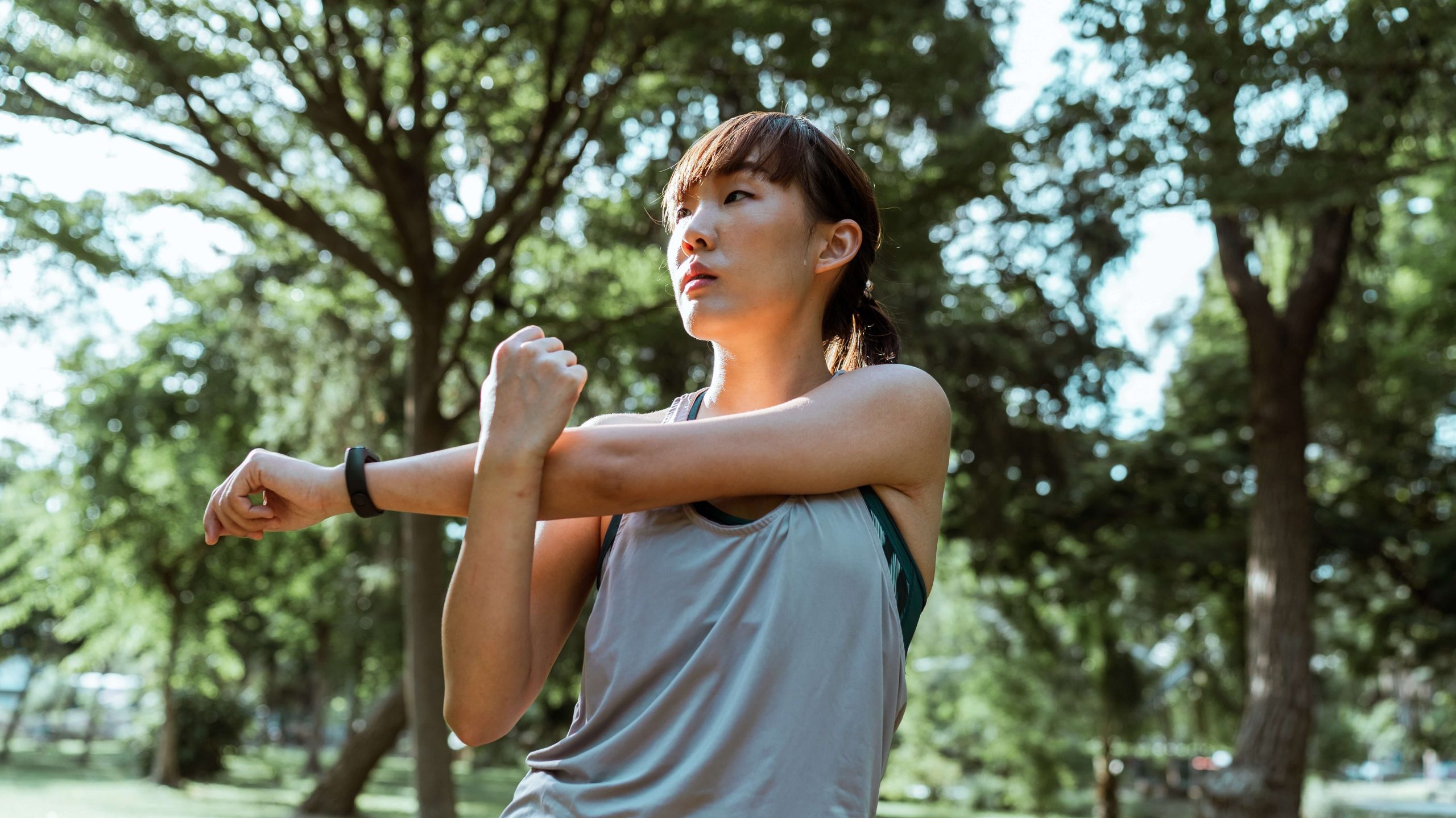 - Pull the straight arm across the chest with the bent arm.