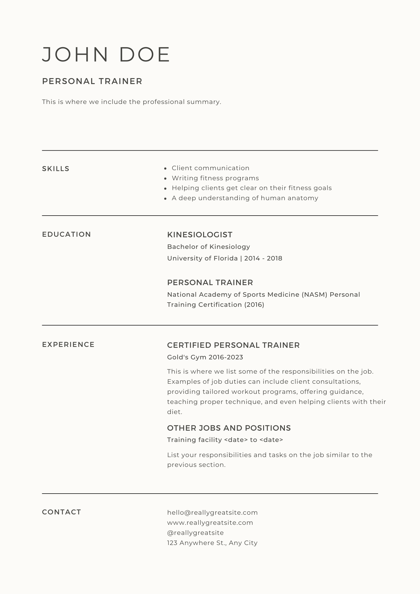 Next, we have the section most employers will probably read first: your experience on the job and employment history. Include your experience as a personal trainer––what gyms you’ve worked at, the positions you’ve held, and your duties on the job.