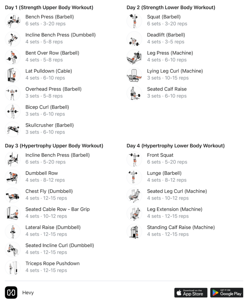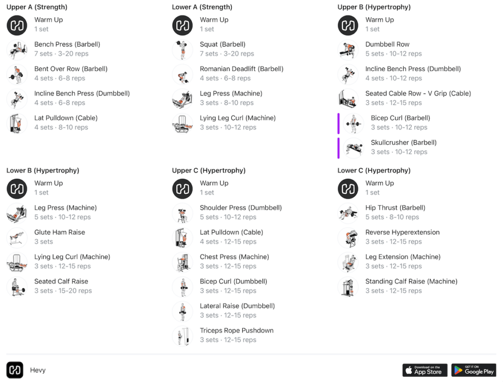So, if you’re interested, download the Hevy app and check out the two PHUL programs in our routine library. You can also create your own program and adjust all the training variables to fit your needs.