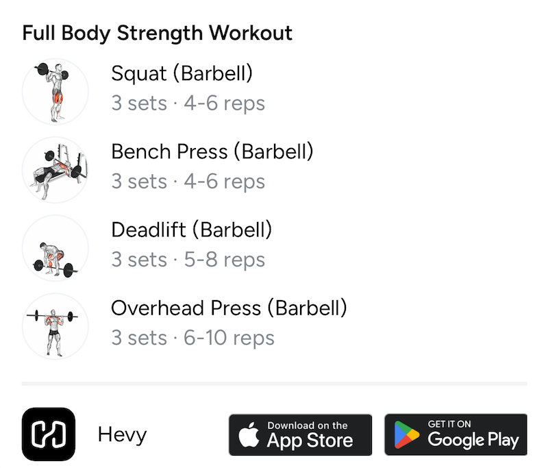 You should also change the exercise order so you don’t start each workout with squats. You can begin one session with squats, one with bench presses, and one with overhead presses. Create workouts, explore existing ones, and get ideas for exercises for your next workout routine with Hevy.
