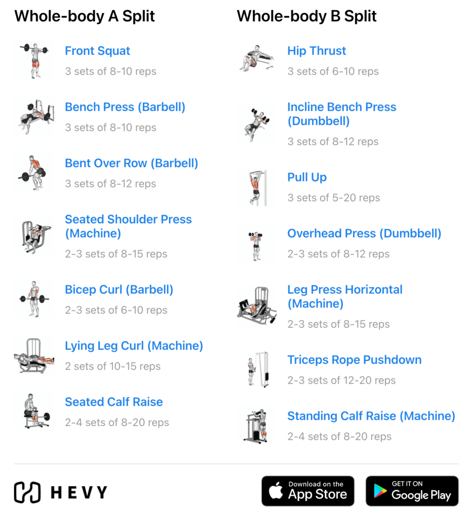 Create your own full-body workouts with Hevy, and track your progress – for free.