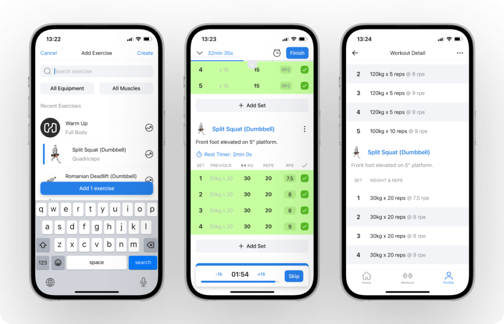- You can use workout templates (routines), change workout variables, monitor exercise performance, log crucial details like movements, sets, repetitions, and RPE, and write custom notes with Hevy.