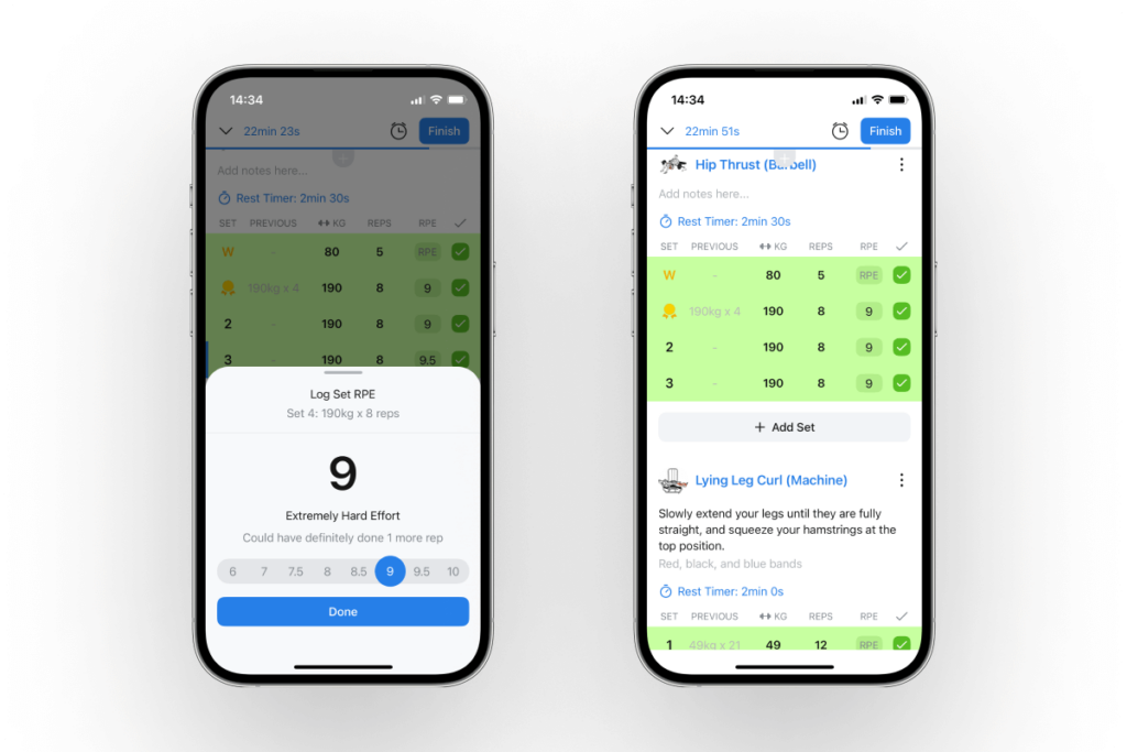For instance, Hevy allows you to log your RPE on all sets and exercises or just the main lifts you want to get stronger on: squats, bench presses, deadlifts, rows, shoulder presses, and such.