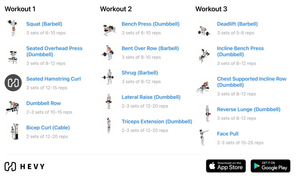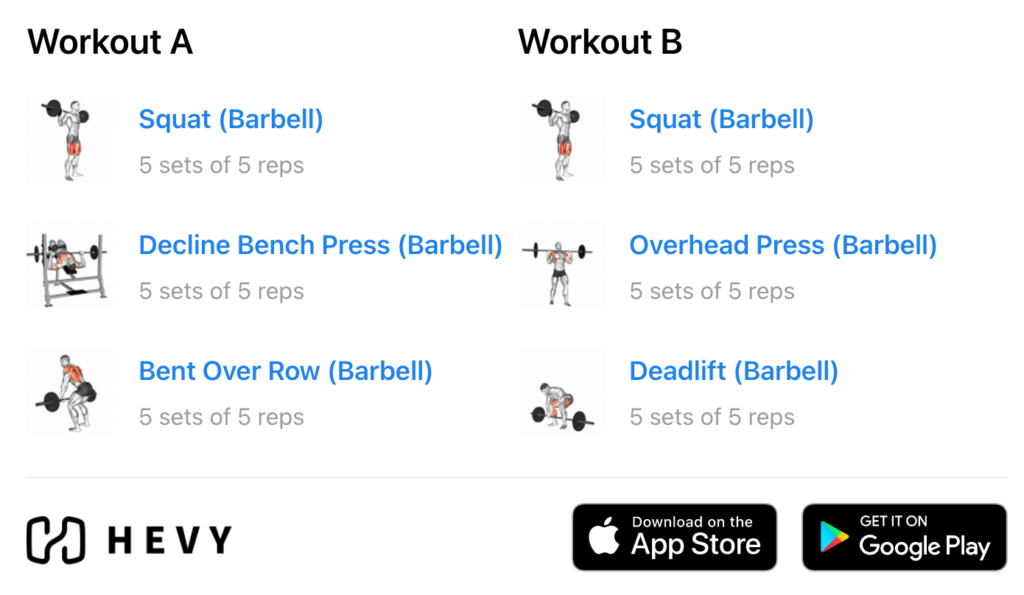 You have two workouts – A and B. With three weekly sessions, you alternate between workouts A and B in two-week cycles. For example, in week 1, you get two A workouts. In week 2, you get two B workouts.