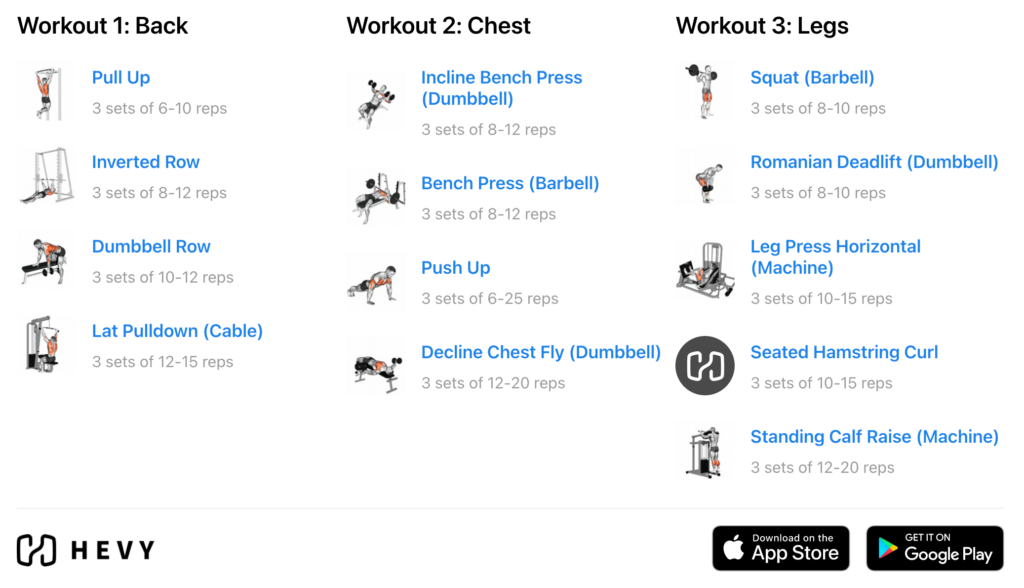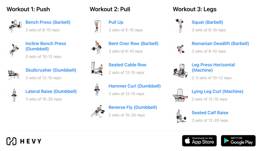 As its name suggests, the push/pull/legs (PPL) plan has you do three unique workouts: