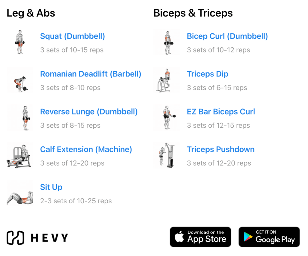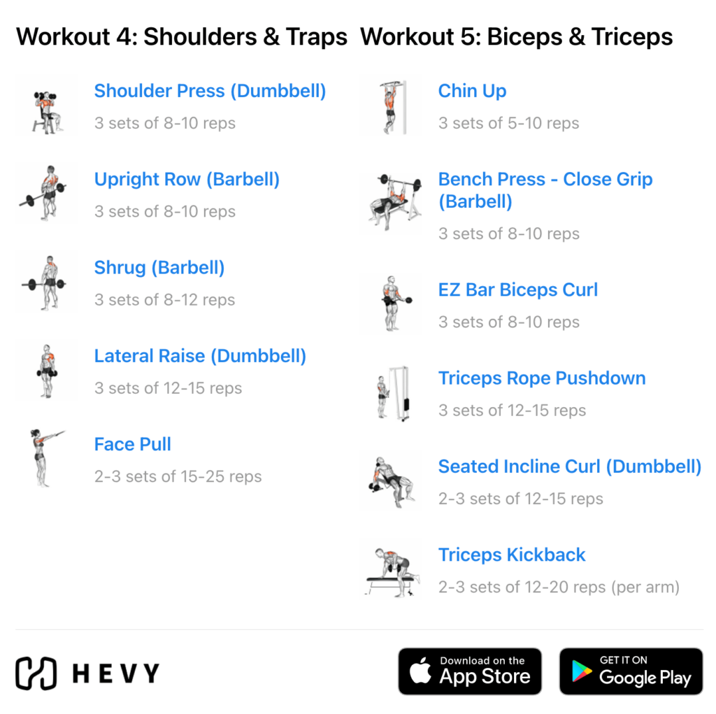 You can also train two, three, four, five, six, or even 7 days per week. For example, the push/pull/legs and upper/lower splits work great for these frequencies. Try the Hevy workout tracker to plan, organize, and track your personalized workout plan.