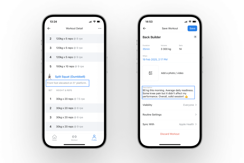 With Hevy, you can write a note for any exercise of your workouts as well as a description for the entire session before saving it to your profile.