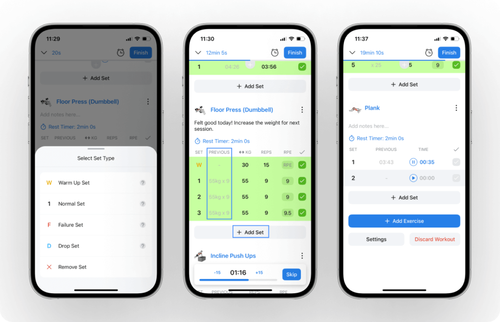 In Hevy, you can easily do that by seeing what you did before in the ‘Previous’ tab. The app lists your set-to-set performance, so you know how hard you need to train to match or exceed what you did before.