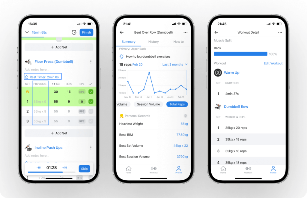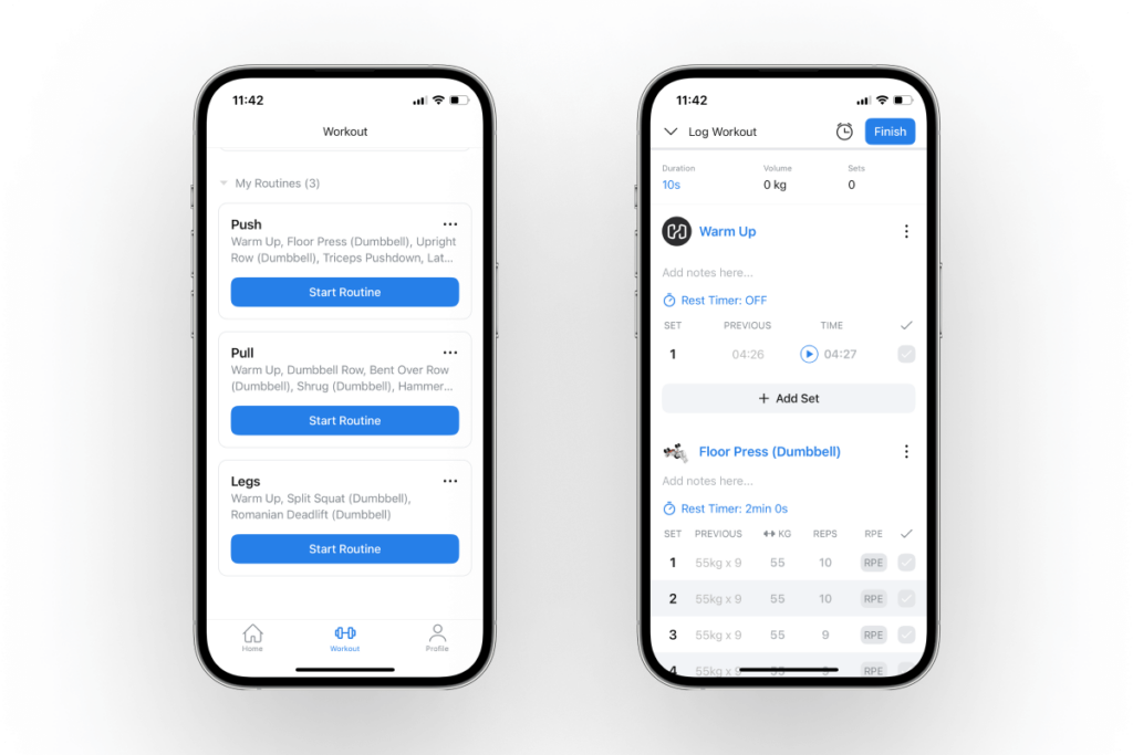 Using Hevy allows you to build workouts and reusable templates, log your workouts on your phone or smartwatch, and analyze workout stats like your volume load, weight, and number of reps. You can also review old workout or exercise notes and easily refer to the previous session’s performance to set a goal for the current workout.
