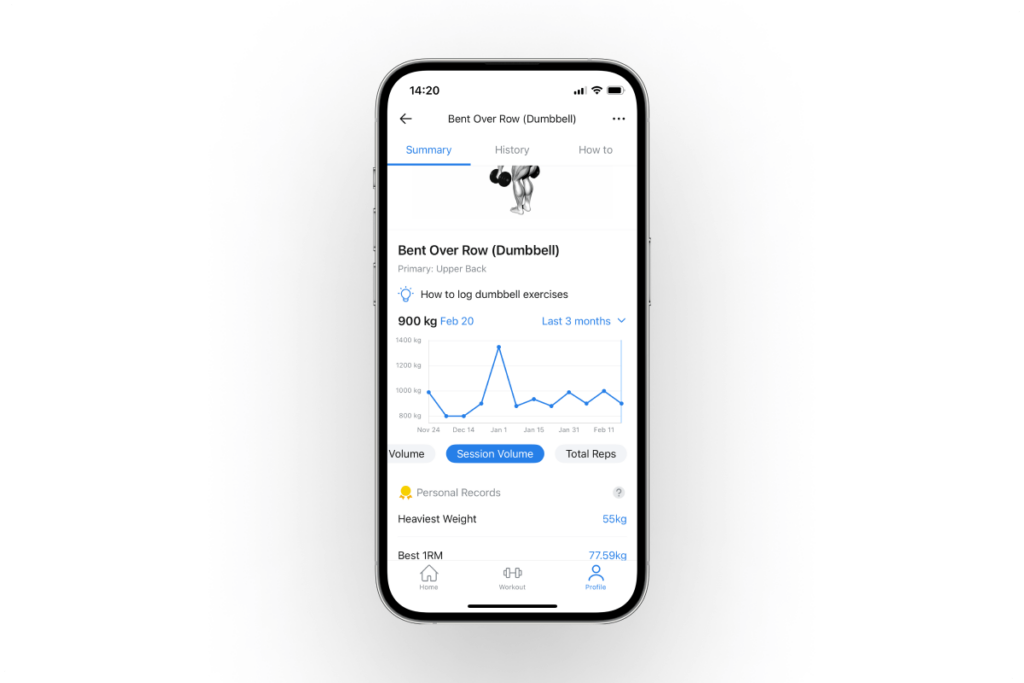 You can scroll through your past workouts to see all the details. Individual graphs display important workout data, such as reps, weight, duration, and overall training volume.