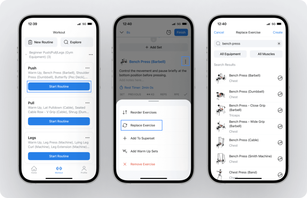 Our app has an extensive exercise library, and you can pick from many movements. Swap an exercise by tapping the three dots next to a movement while logging a live session or creating a routine (reusable template) and selecting Replace Exercise.