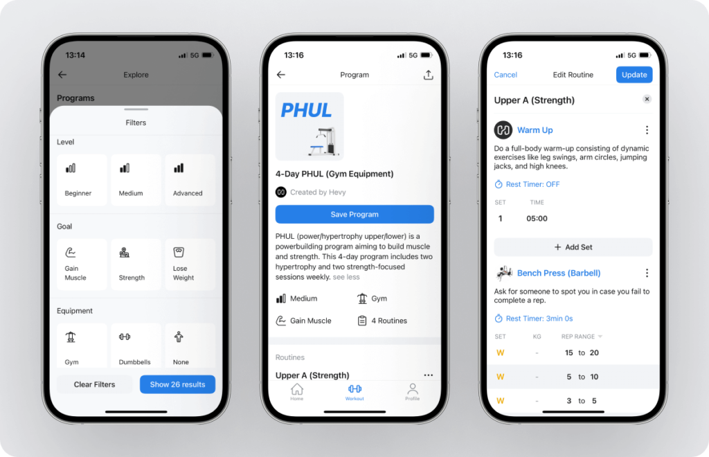 For programming ideas and inspiration, explore Hevy’s routine library. It offers 25+ fully customizable programs, each with training details and tips. Browse the library (Workout tab > Explore), save any plan you like, edit the workouts, and log sessions anytime.