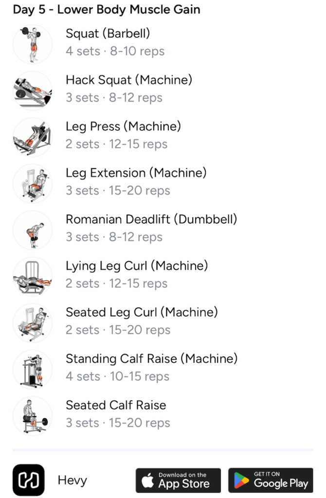 | Day 5 – Lower Body Muscle Gain | |||