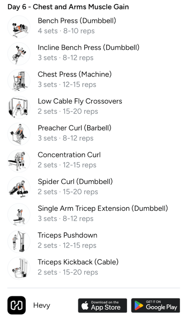 | Day 6 – Chest and Arms Muscle Gain | |||