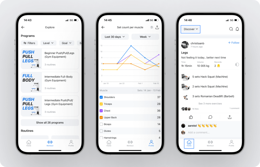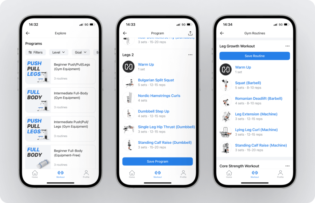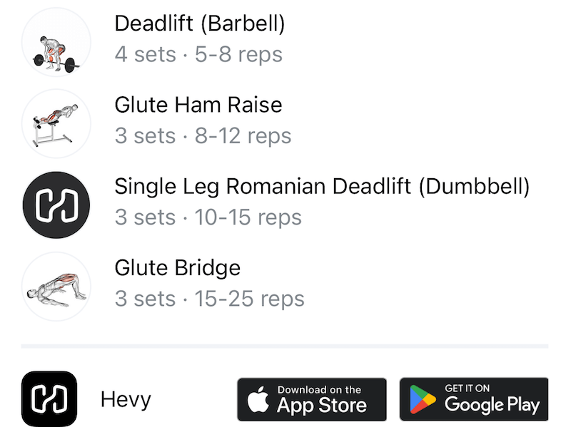 Looking for more effective leg and glute workouts or entire training plans? Download the Hevy app, navigate to the routine library (Workout tab > Explore), and browse the 25+ programs for all levels, as well as individual gym, home, resistance band, dumbbell-only, and travel routines. Save the ones you like to your library to use at any time.