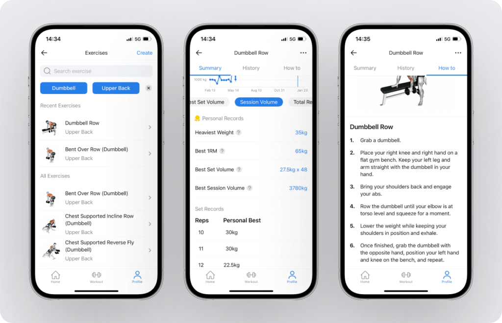 Hevy’s exercise library includes a variety of dumbbell back exercises and 400+ movements for other muscles you can use to build workouts. Each movement comes with how-to instructions and a demo animation. You can track your performance on each activity you log to make sure you’re making progress.