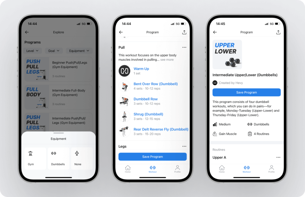 Download the Hevy app, navigate to the program library (Workout > Explore), and use the filter for Equipment > Dumbbells to access multiple programs for all levels. Browse through the list, see the details, and save any program (or single workout) to your library to use anytime.