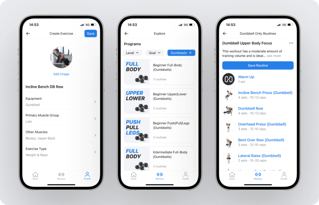 Check out the Hevy app and its highly curated library with 400+ exercises, each with how-to instructions, a demo animation, and other useful info. You can also create custom exercises to reuse when building workouts and browse the program library to find dumbbell-only programs for all experience levels.