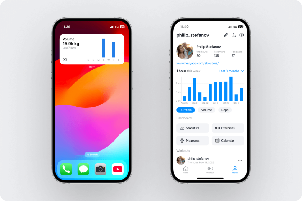 Hevy offers a variety of homescreen widgets for iOS and Android. They make logging workouts and tracking progress more convenient, keeping you informed and motivated.