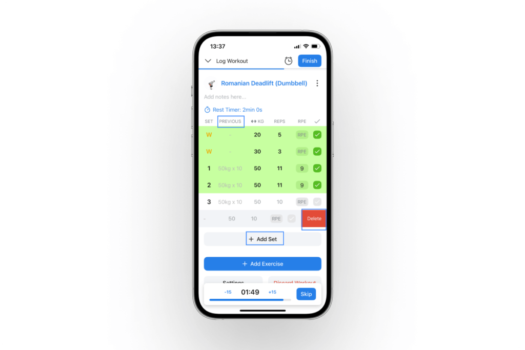For example, I use Hevy to log my workouts. I can easily add or remove sets for any exercise, write down my repetitions and weight for each lift, and see my previous performance (under the Previous column).