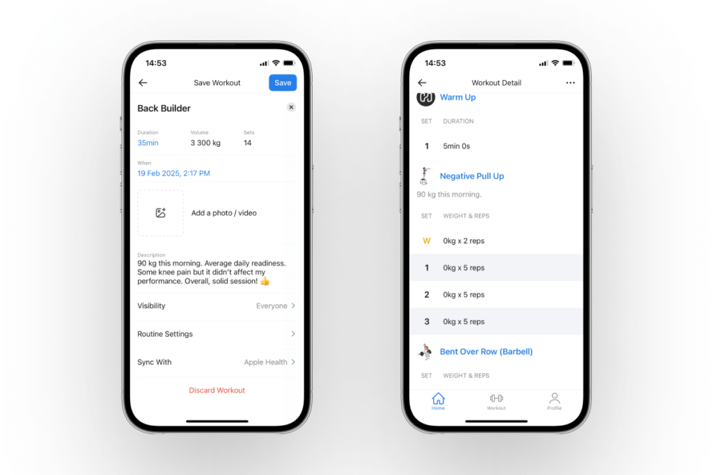 In Hevy, you can freely add movements to any workout and write a note to any exercise to clarify details that could be useful when reviewing your completed strength training sessions later.
