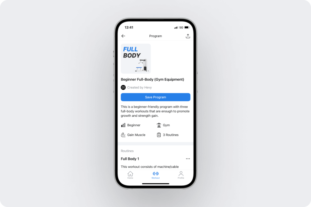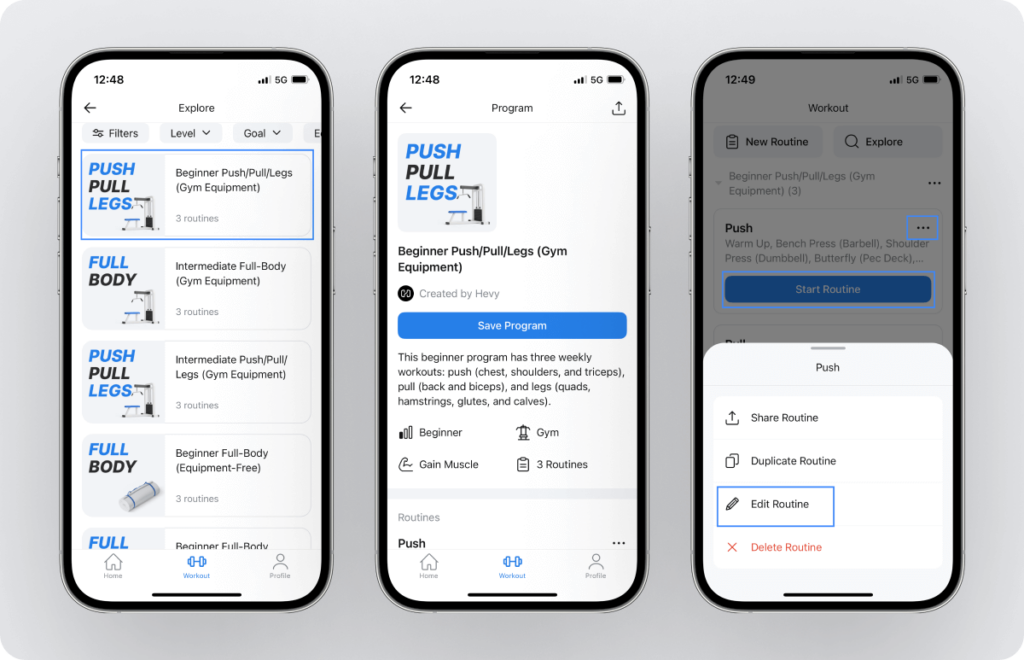 For programming ideas and inspiration, explore Hevy’s routine library. It offers 25+ fully customizable programs, each with training details and tips. Browse the library (Workout tab > Explore), save any plan you like, edit the workouts, and log sessions anytime.