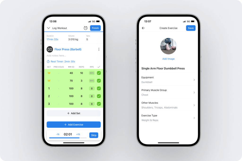 Our app has an extensive exercise library, and you can pick from many movements. Swap an exercise by tapping the three dots next to a movement while logging a live session or creating a routine (reusable template) and selecting Replace Exercise.