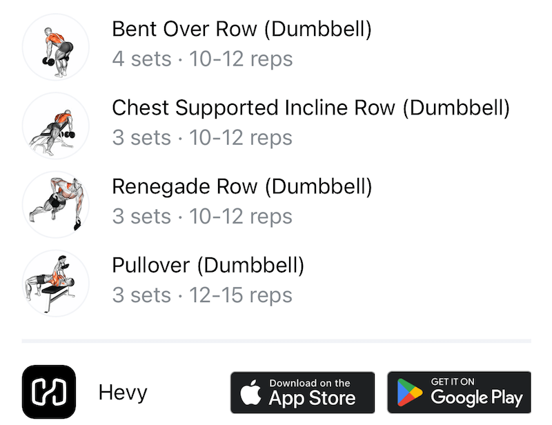 Hevy’s exercise library includes a variety of dumbbell back exercises and 400+ movements for other muscles you can use to build workouts. Each movement comes with how-to instructions and a demo animation. You can track your performance on each activity you log to make sure you’re making progress.